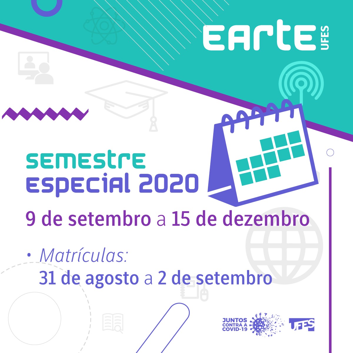 Em função das demandas que estão sendo encaminhadas à Universidade pelos veículos de comunicação, a Administração Central da Ufes informa que, após realizar um amplo debate com a participação da comunidade acadêmica, o Conselho de Ensino, Pesquisa e Extensão (Cepe) da Universidade aprovou, no dia 18 de agosto, a Resolução nº 30/2020, que regulamenta a implementação do Ensino-Aprendizagem Remoto Temporário e Emergencial (Earte), a ser adotado a partir do dia 9 de setembro, indo até 15 de dezembro, em um semestre especial cujo calendário também foi aprovado pelo Cepe.