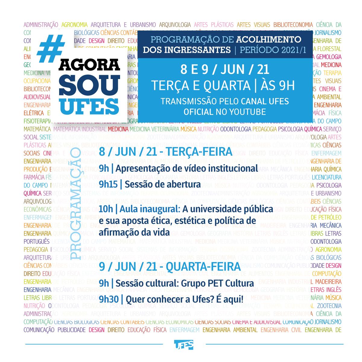 A Pró-Reitoria de Graduação da Ufes realiza nos dias 8 e 9 de junho um evento de acolhimento aos estudantes que estarão ingressando na Ufes no semestre letivo 2021/1. O evento terá início às 9 horas, de forma on-line, com transmissão pelo canal Ufes Oficial no YouTube.