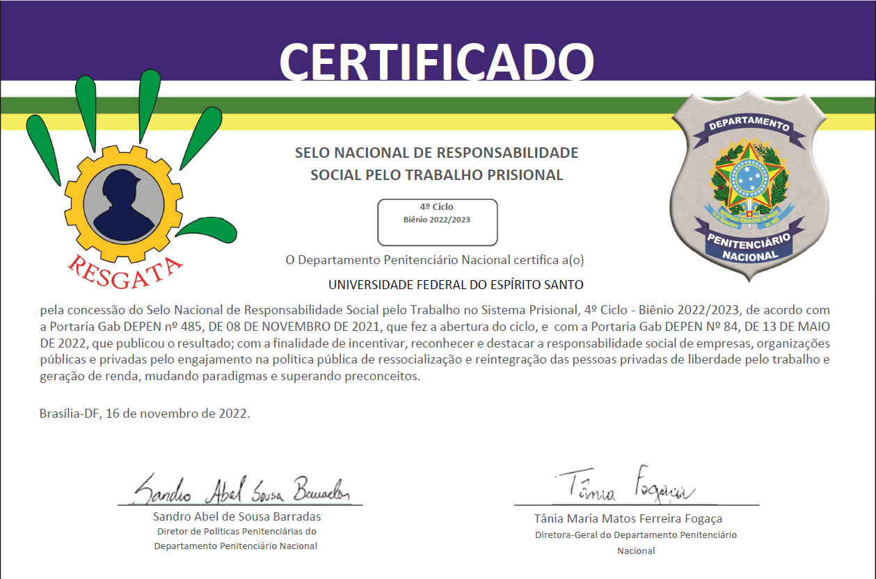A Ufes foi uma das instituições contempladas com o Selo Nacional de Responsabilidade Social pelo Trabalho Prisional – Resgata, concedido pelo Departamento Penitenciário Nacional. O reconhecimento se deve ao trabalho com detentos do sistema penitenciário e reeducandos desenvolvido por meio do convenio com a Secretaria de Estado da Justiça (Sejus) e do projeto Impactando Vidas.