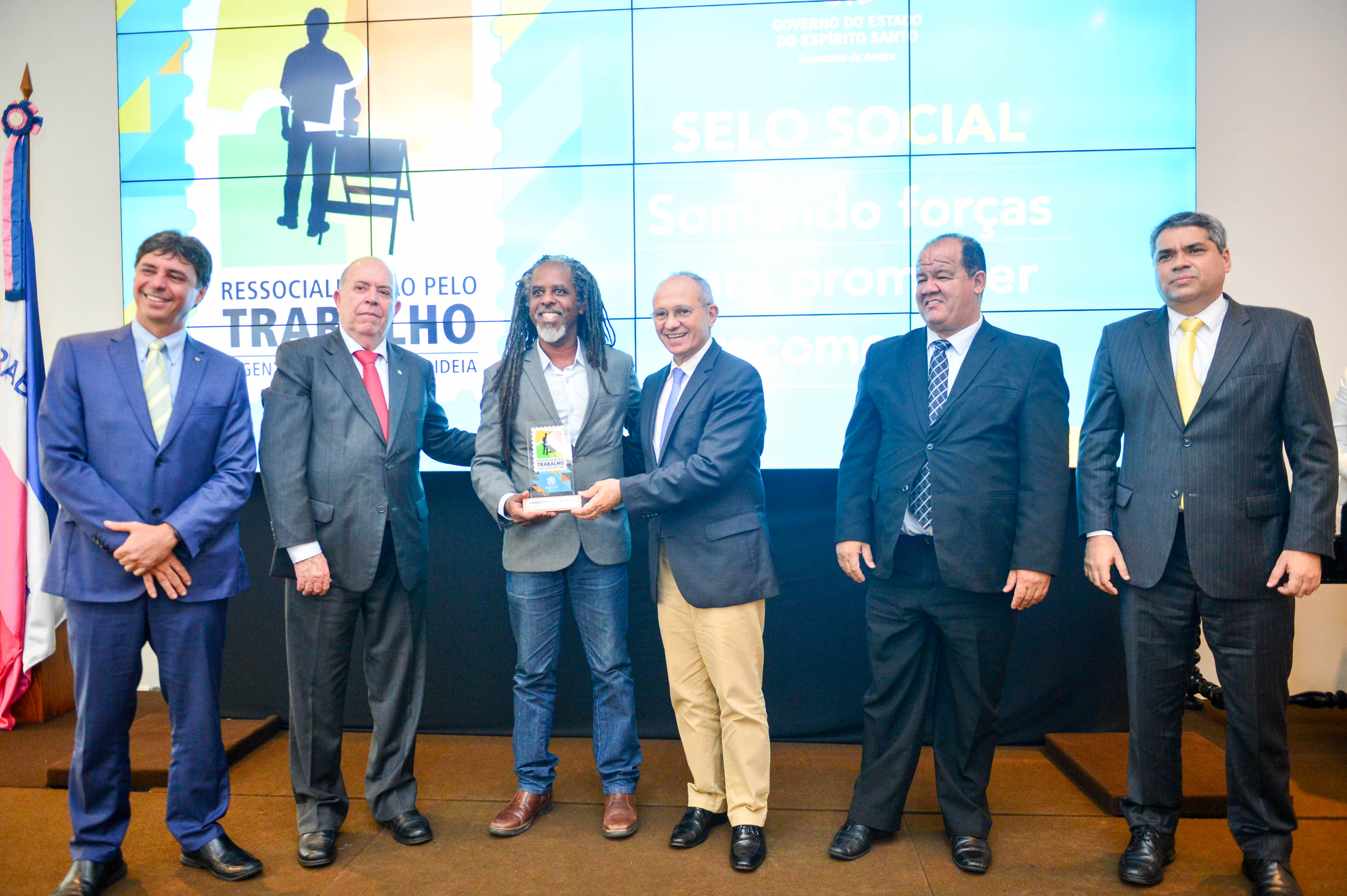 O diretor do Departamento de Ações Afirmativas e Diversidade da Pró-Reitoria de Assuntos Estudantis e Cidadania (Proaeci) Gustavo Henrique Araújo Forde (na foto, ao centro) representou o reitor da Universidade na cerimônia. Em nome da Ufes, ele recebeu a homenagem entregue pelo governador Paulo Hartung. Na solenidade realizada pela Sejus, 57 empresas capixabas receberam o “Selo Social – 2017” como participantes do Programa de Responsabilidade Social e Ressocialização. Sete instituições, incluindo a Ufes, receberam o prêmio “Amigos da Ressocialização”.