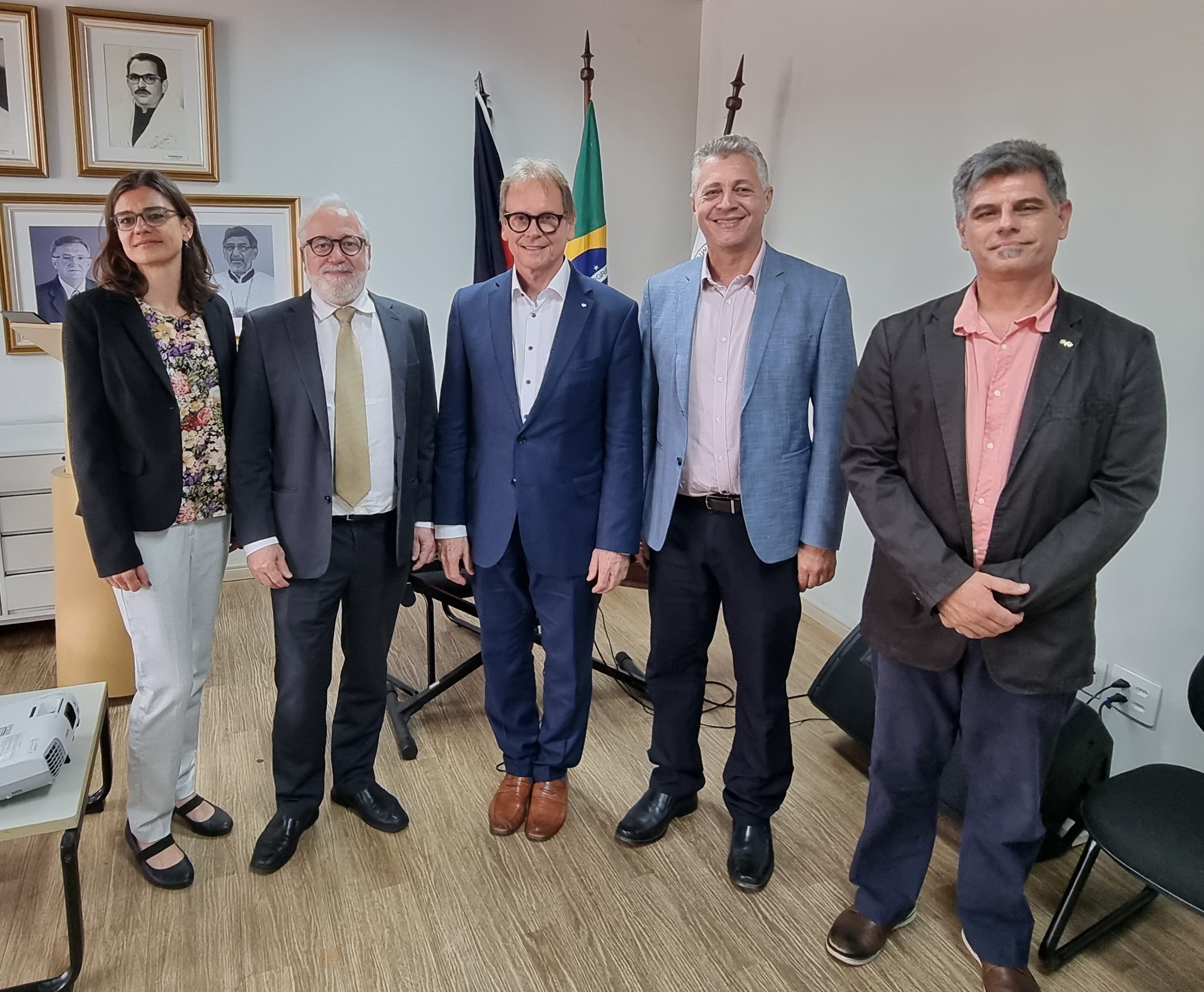 Na foto, a cônsul honorária Jenny Sander; o reitor da Ufes, Paulo Vargas; o cônsul geral Joachim Schemel; o vice-reitor da Ufes, Roney Pignaton; e o secretário de Relações Internacionais da Ufes, Yuri Leite.