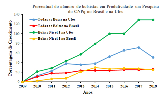 Os dados são do Departamento de Pesquisa da Pró-Reitoria de Pesquisa e Pós-Graduação (PRPPG) da Ufes. Segundo os índices apurados, o destaque é maior quando considera apenas o número de Bolsistas em Produtividade Nível 1, que obteve um crescimento de 128,6%, enquanto o crescimento nacional foi de 25%.