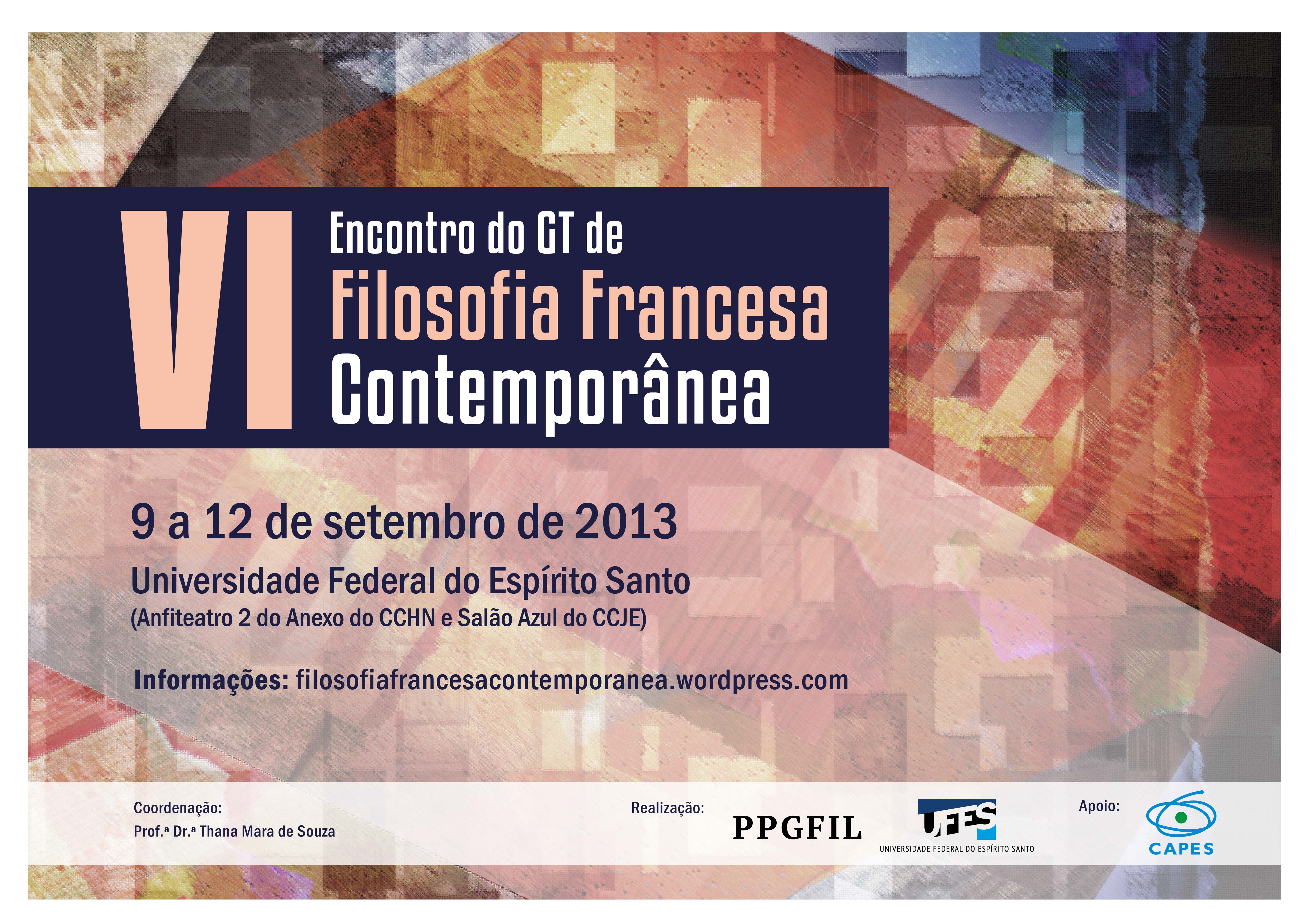 A Ufes sedia, entre os dias 9 e 12 de setembro, o VI Encontro do Grupo de Trabalho de Filosofia Contemporânea Francesa. O evento acontecerá no Anfiteatro 2 do Anexo do Centro de Ciências Humanas e Naturais (CCHN) e no Salão Azul do Centro de Ciências Jurídicas e Econômicas (CCJE). Durante o encontro serão realizadas conferências, apresentações e mesas de debates.