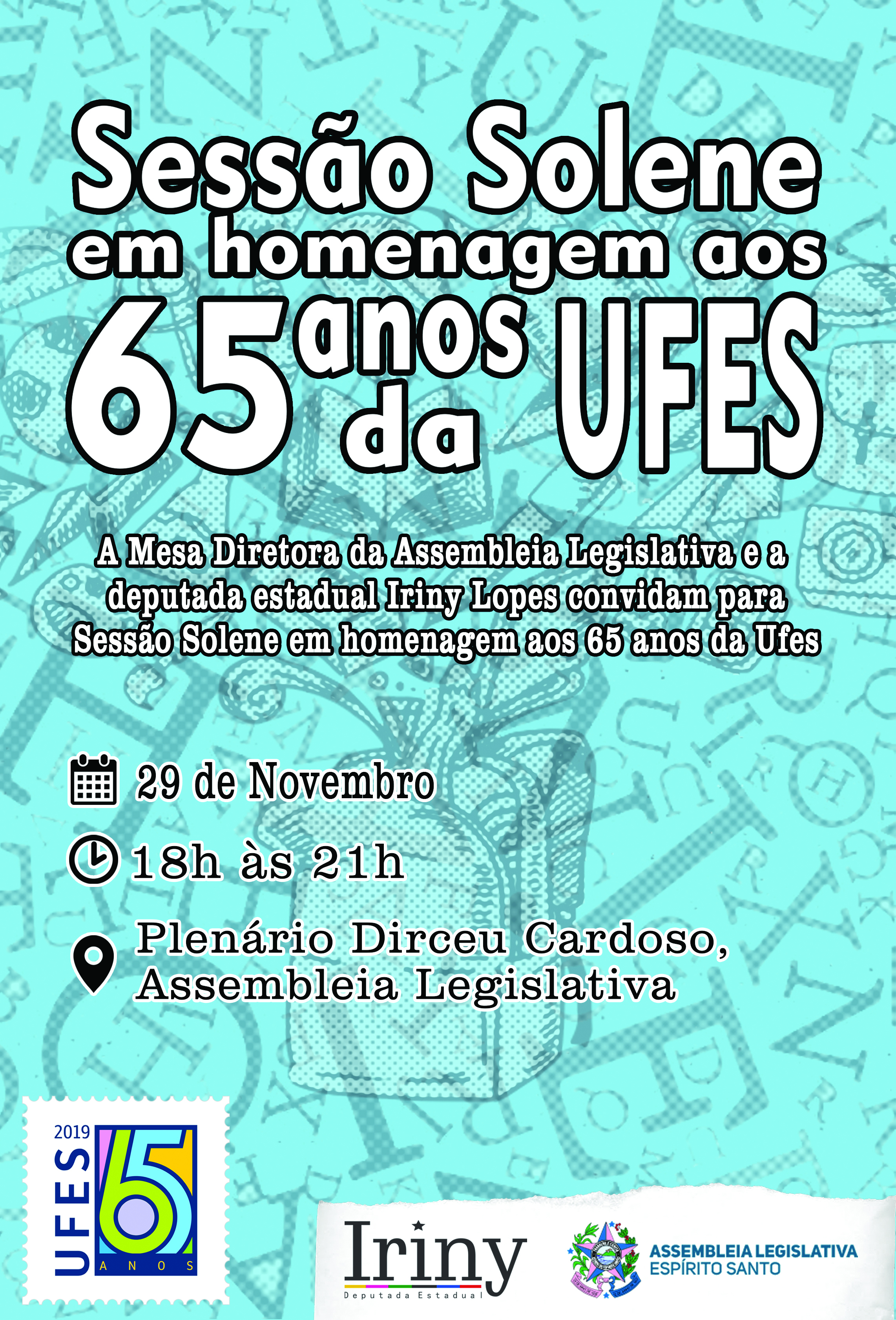 A Ufes será homenageada pelos seus 65 anos em sessão solene a ser realizada nesta sexta-feira, 29, às 18 horas, na Assembleia Legislativa do Espírito Santo. A homenagem foi proposta pela deputada estadual Iriny Lopes.