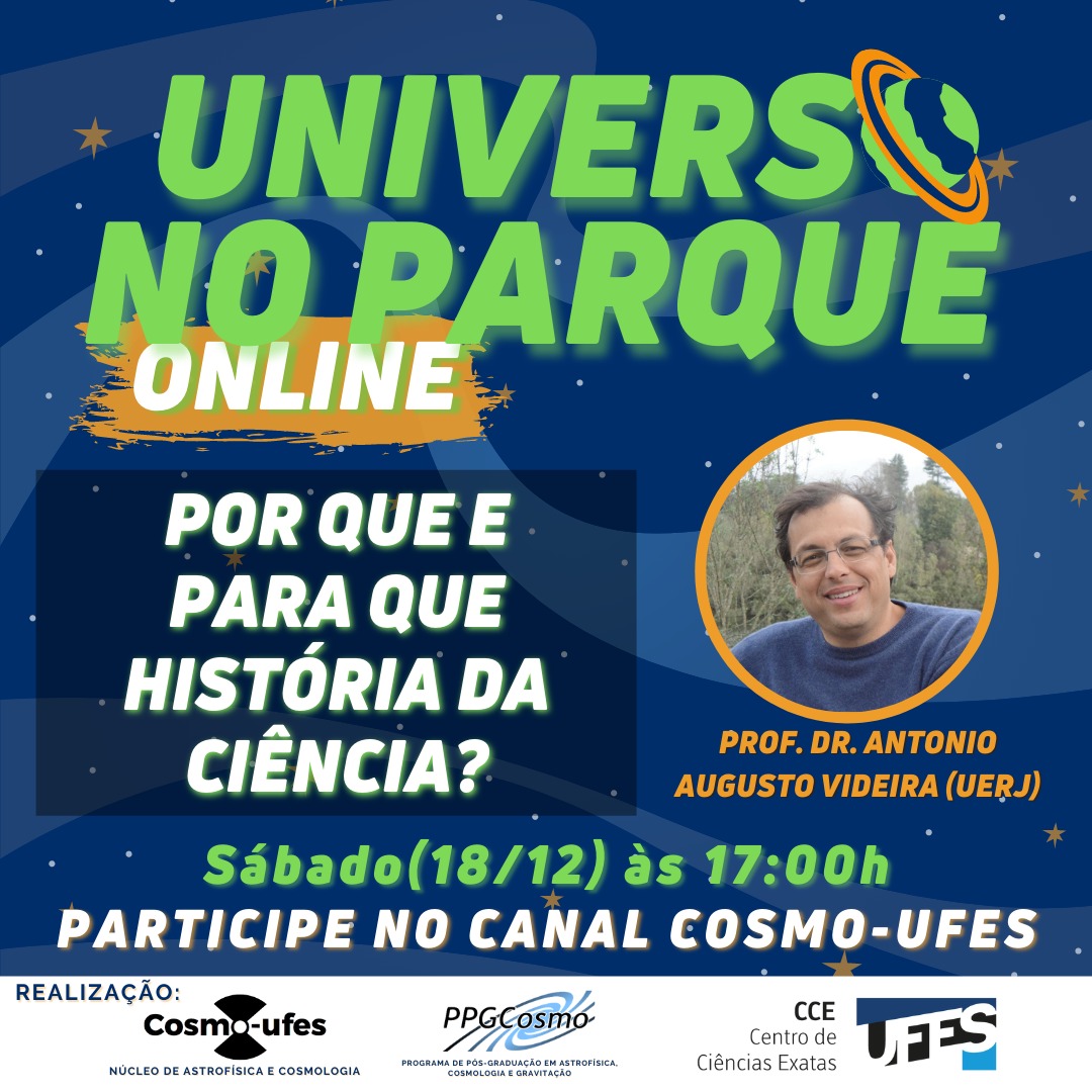 Por que e para que história da Ciência? é o tema da palestra que será ministrada neste sábado, 18, às 17 horas, pelo professor do Instituto de Filosofia e Ciências Humanas da Universidade Estadual do Rio de Janeiro (Uerj) Antonio Augusto Videira. O evento é gratuito e faz parte do projeto Universo no Parque, do Departamento de Física da Ufes.